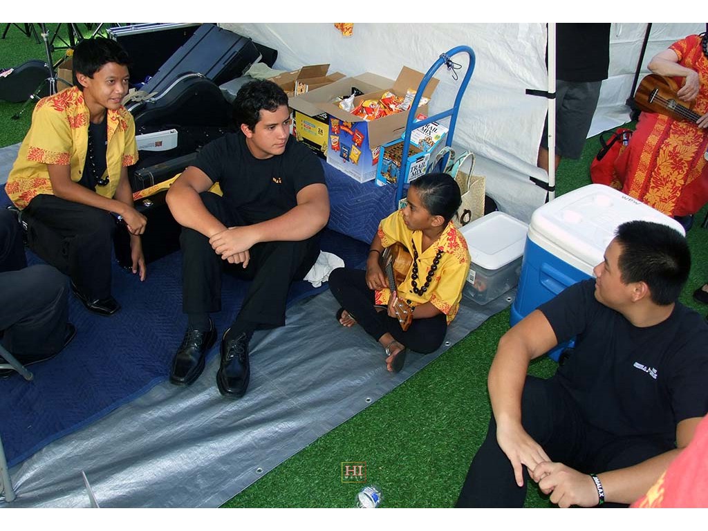Another Ke Kula Mele Hawaii Green Room Photo with Keen Ching, Quincy Maka'awa'awa, Mālie Lyman, and Sid Pang.