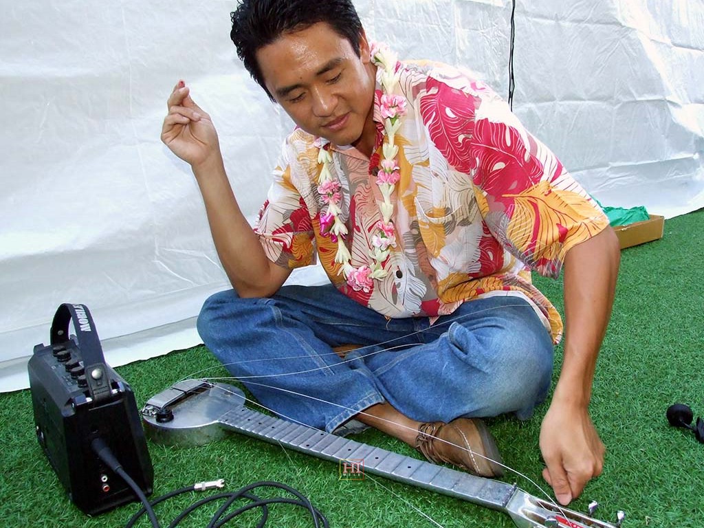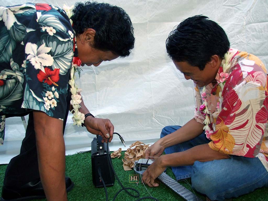Bobby Ingano consults with Jeff Au Hoy during a string change.