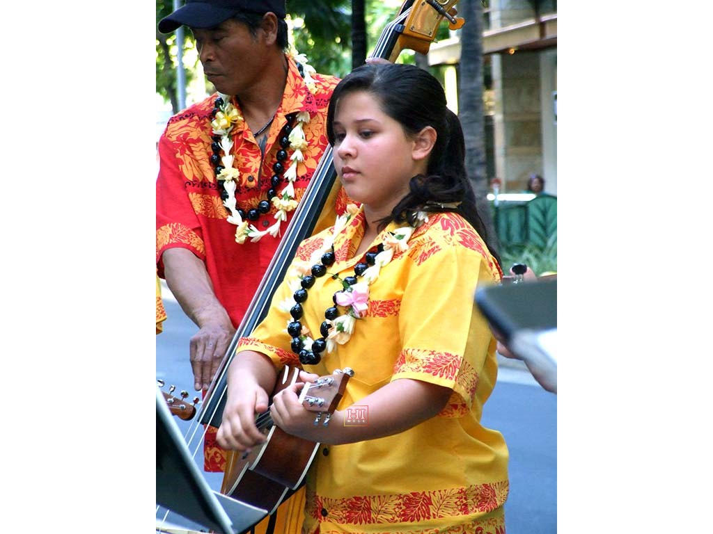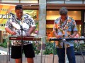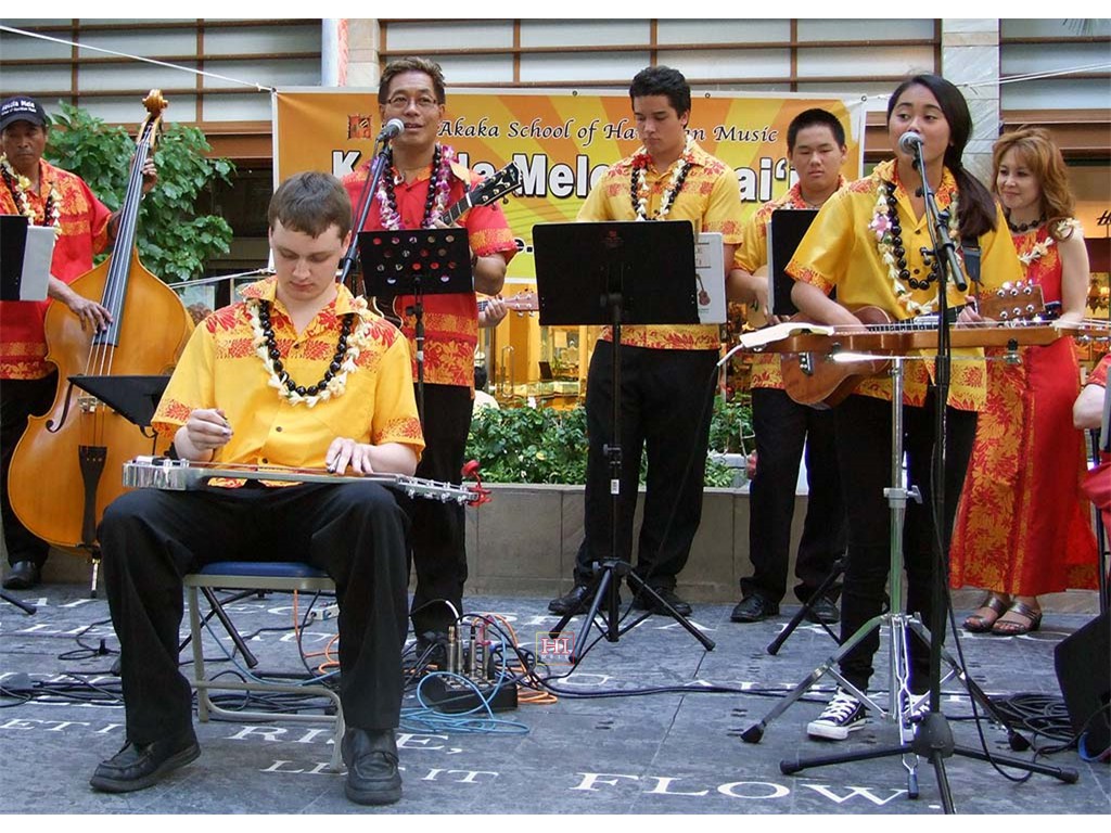 Ke Kula Mele Hawaii ensemble featuring Mark Prucha on the steel guitar and Kalyn Aolani on the 'Ukulele and steel guitar, with Ronald Tolentino, Alan Akaka, Quincy Maka'awa'awa, Sid Pang and Michiko Akaka.