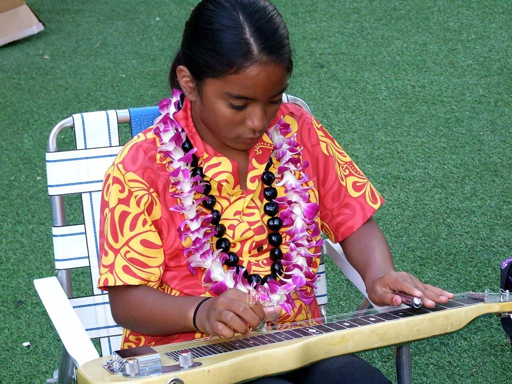 Ke Kula Mele Hawaii Ensemble Player Larry Holu and Ke Kula Mele steel guitar student Pūloku Hayes from Los Angeles.
