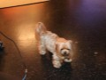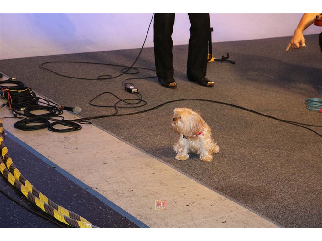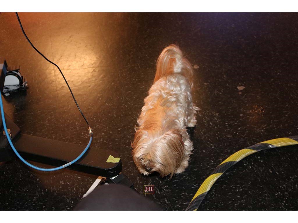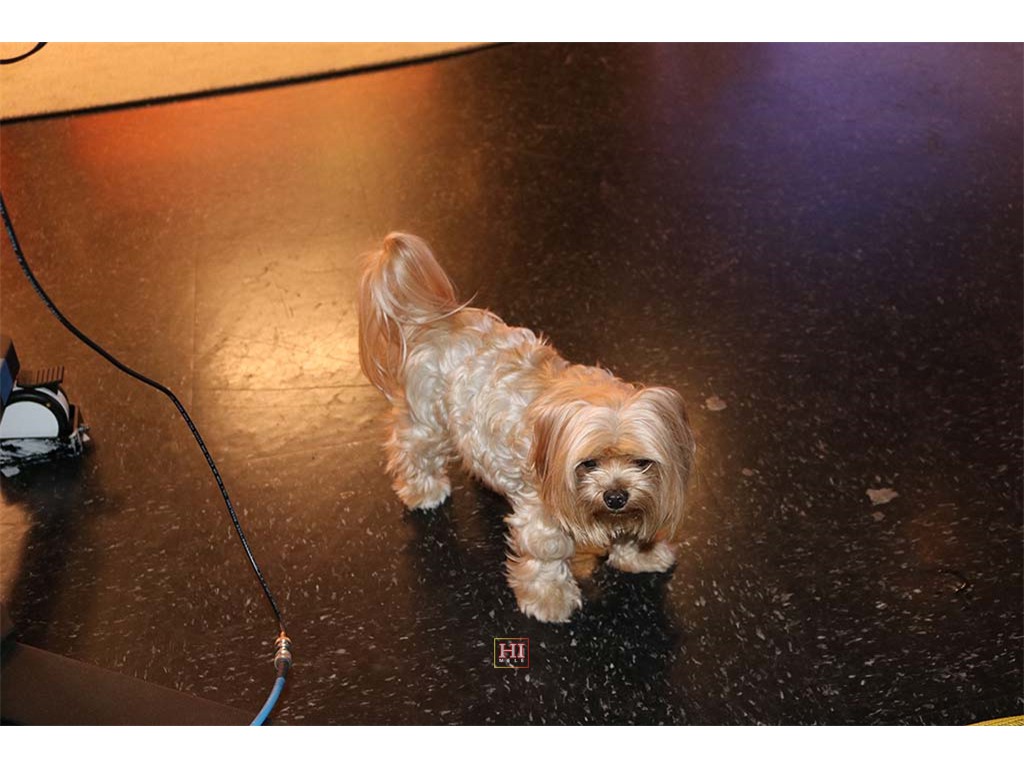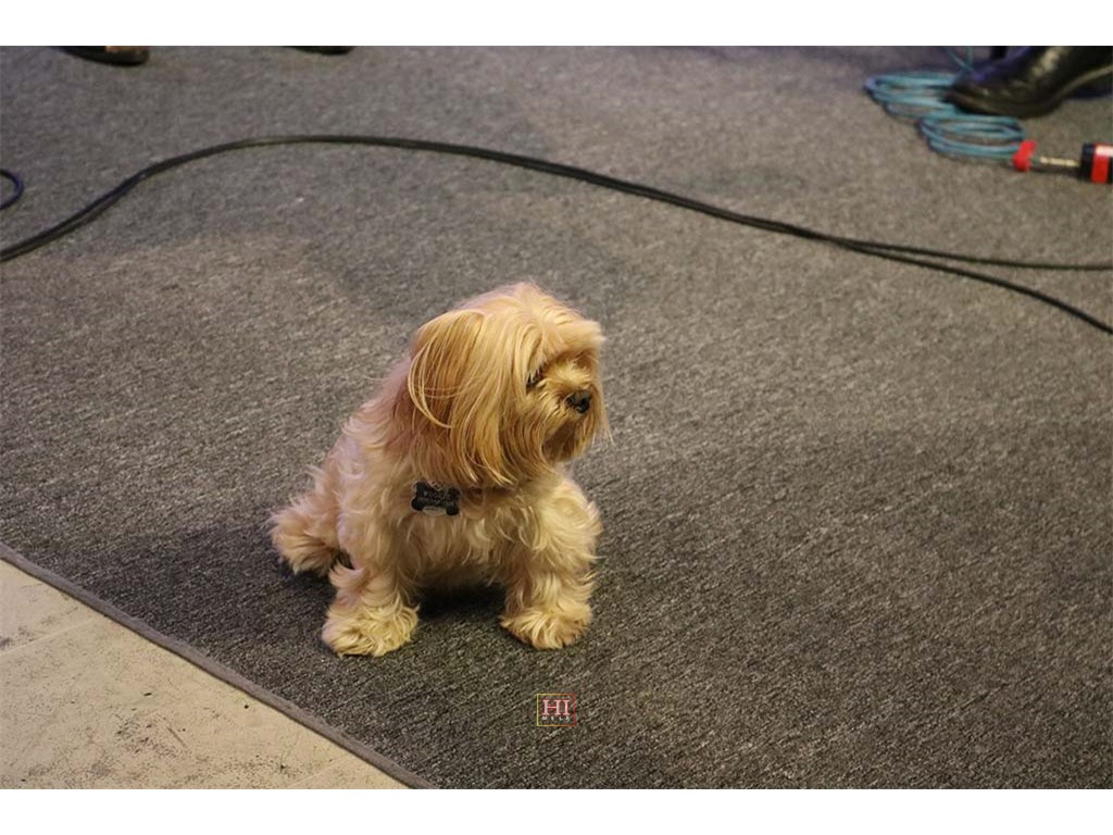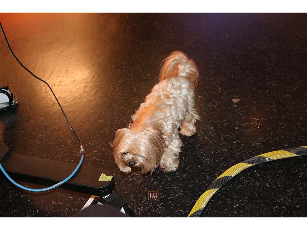 Sunny greets the musicians. Sunny is television personality Grace Lee's pet and one of the Hawaii News Now Sunrise team.