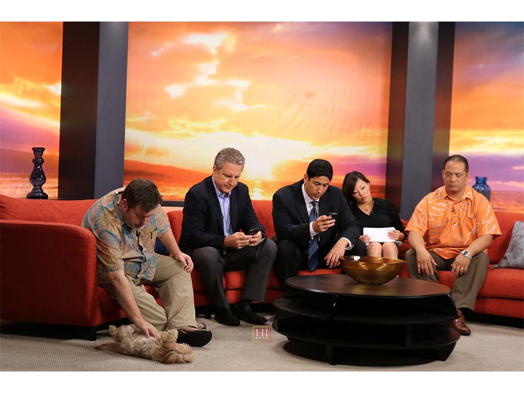 The Hawaii News Now Sunrise crew during a break: Howard Dicus with Sunny, Dan Cooke, Steve Uyehara, Grace Lee, and Billy V.