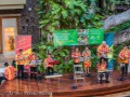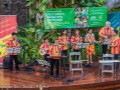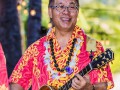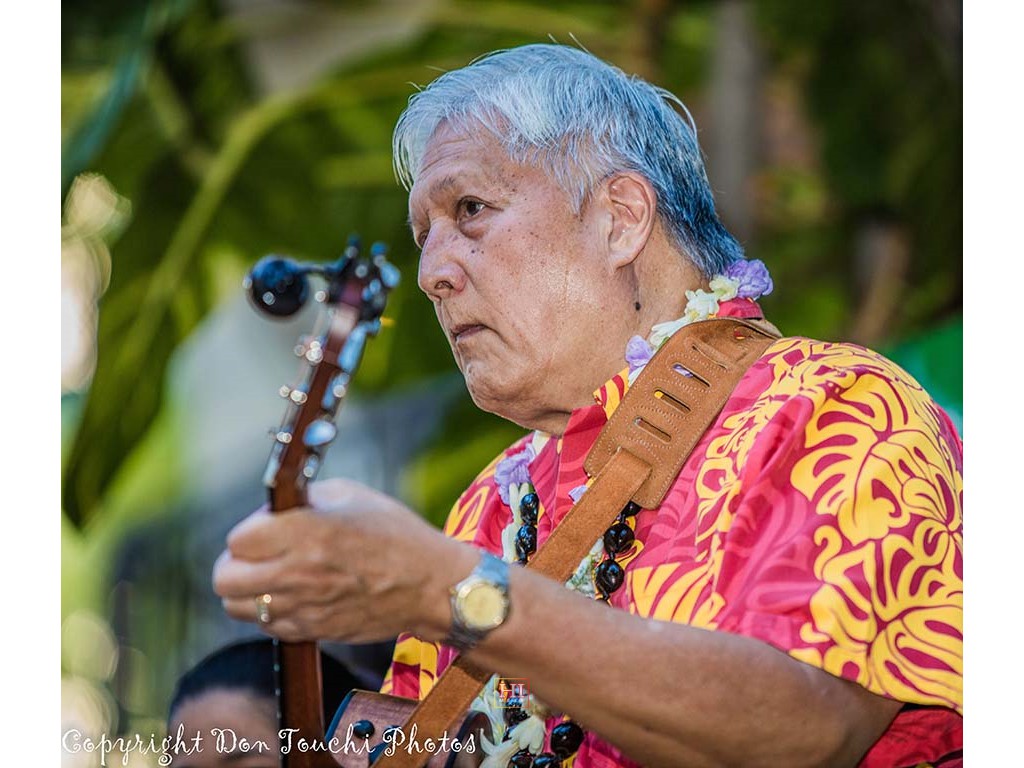 All of the ensemble musicians play multiple instruments. Here some steel guitarists take up duty on the ʻukulele as Next Generation steel guitarist Mālie Lyman performs. Ron Tolentino is on U-bass.