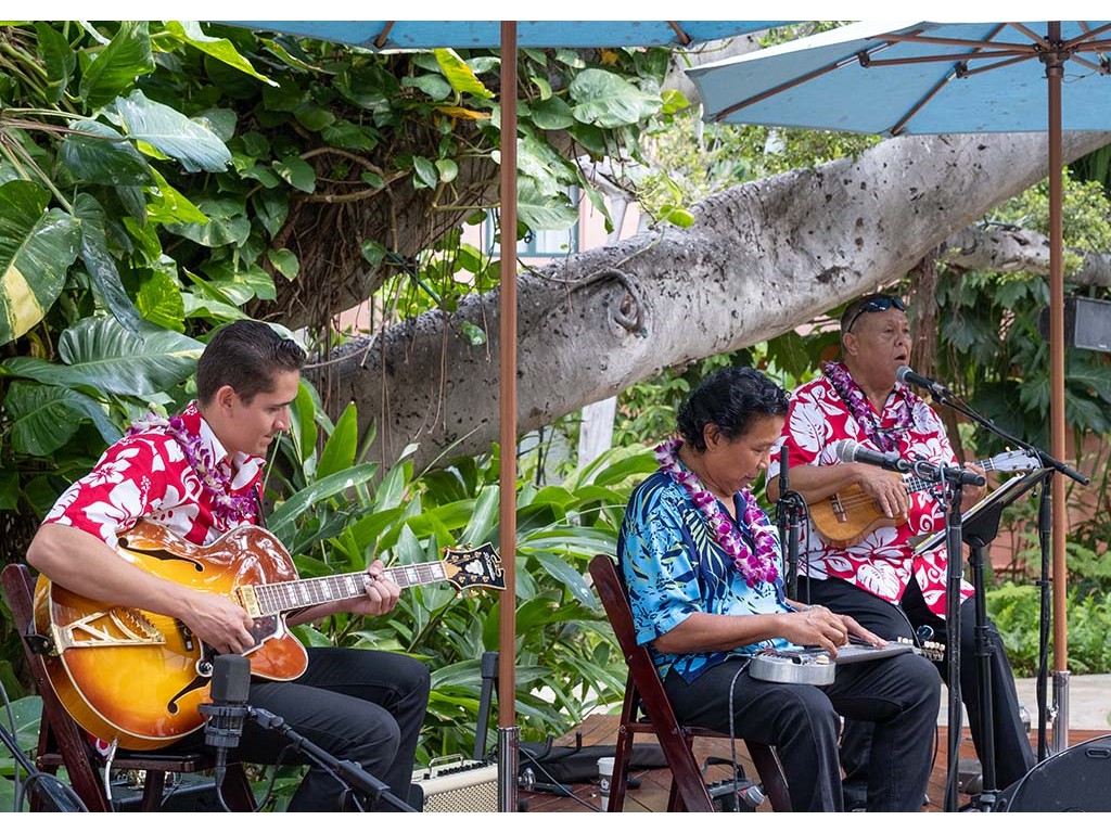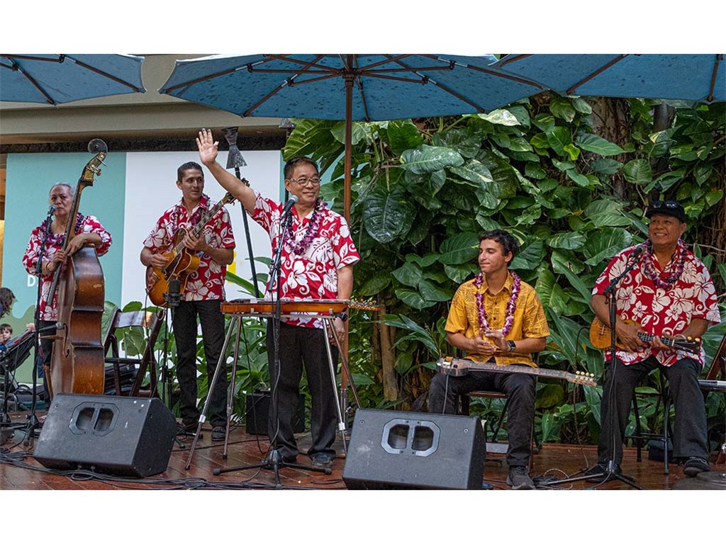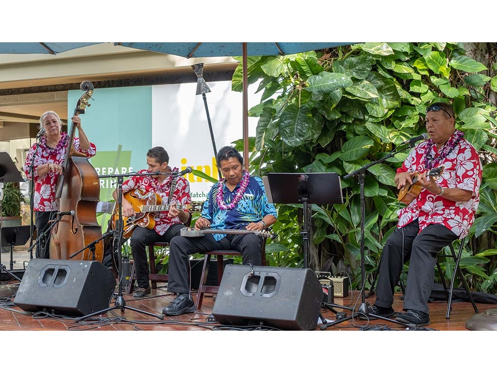 Featured steel guitarist Alan Akaka with Helene Woodward, Joseph Zayac, and Kaipo Asing.
