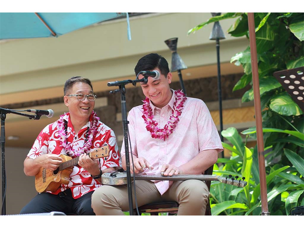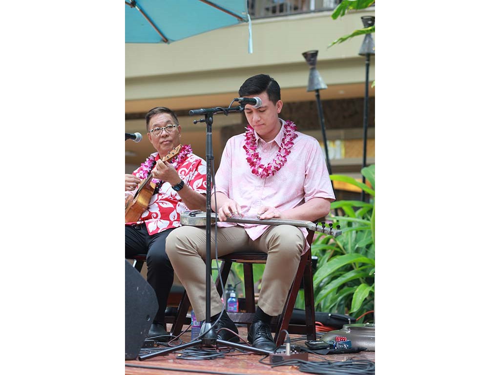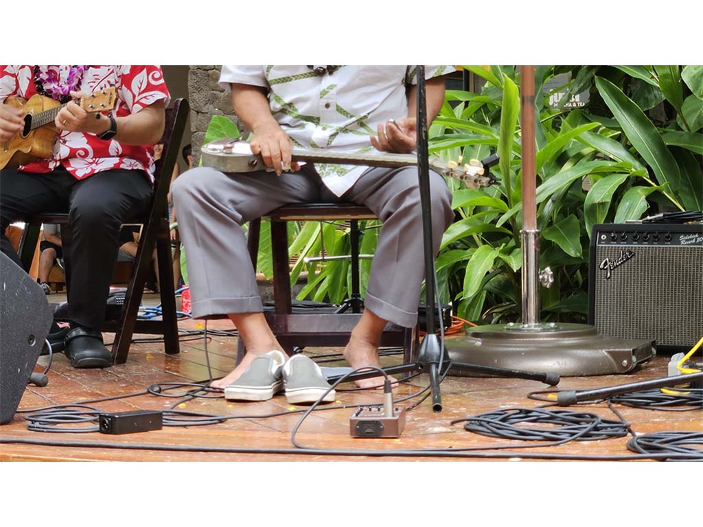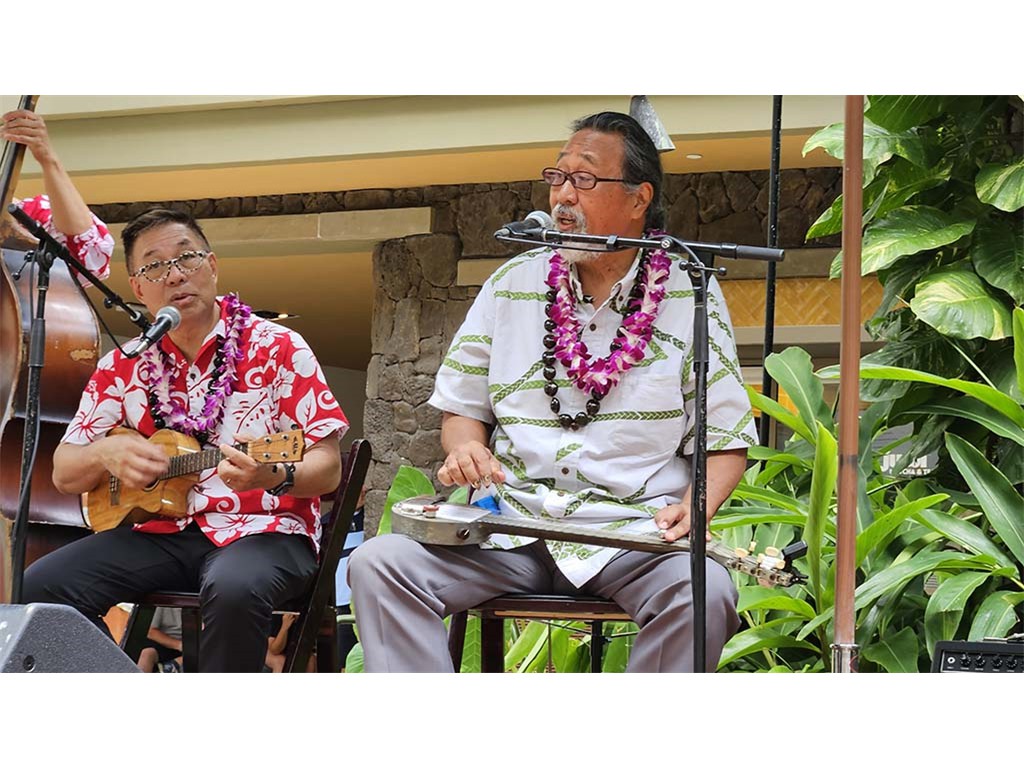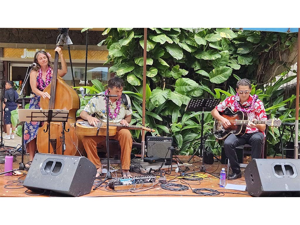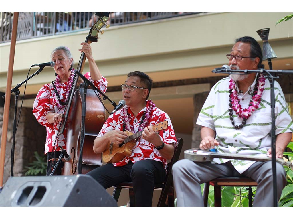 Featured steel guitarist Greg Sardinha with Dennis ʻʻBlaʻʻ Keohokālole and Kata Maduli.