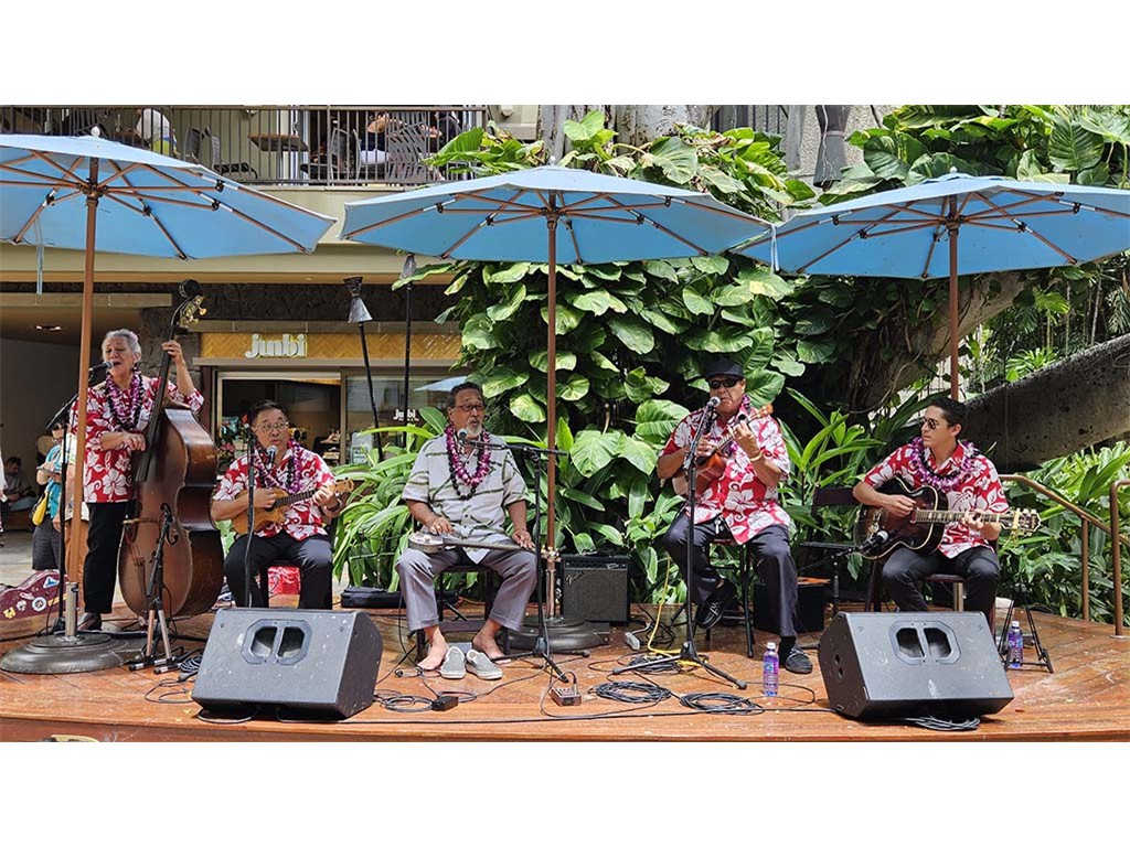 Featured steel guitarist Geronimo ''Geri'' Valdriz with Helene Woodward, Alan Akaka, Kaipo Asing, and Joseph Zayac.