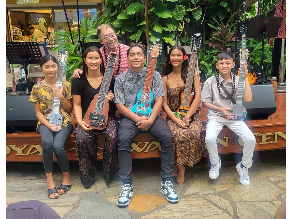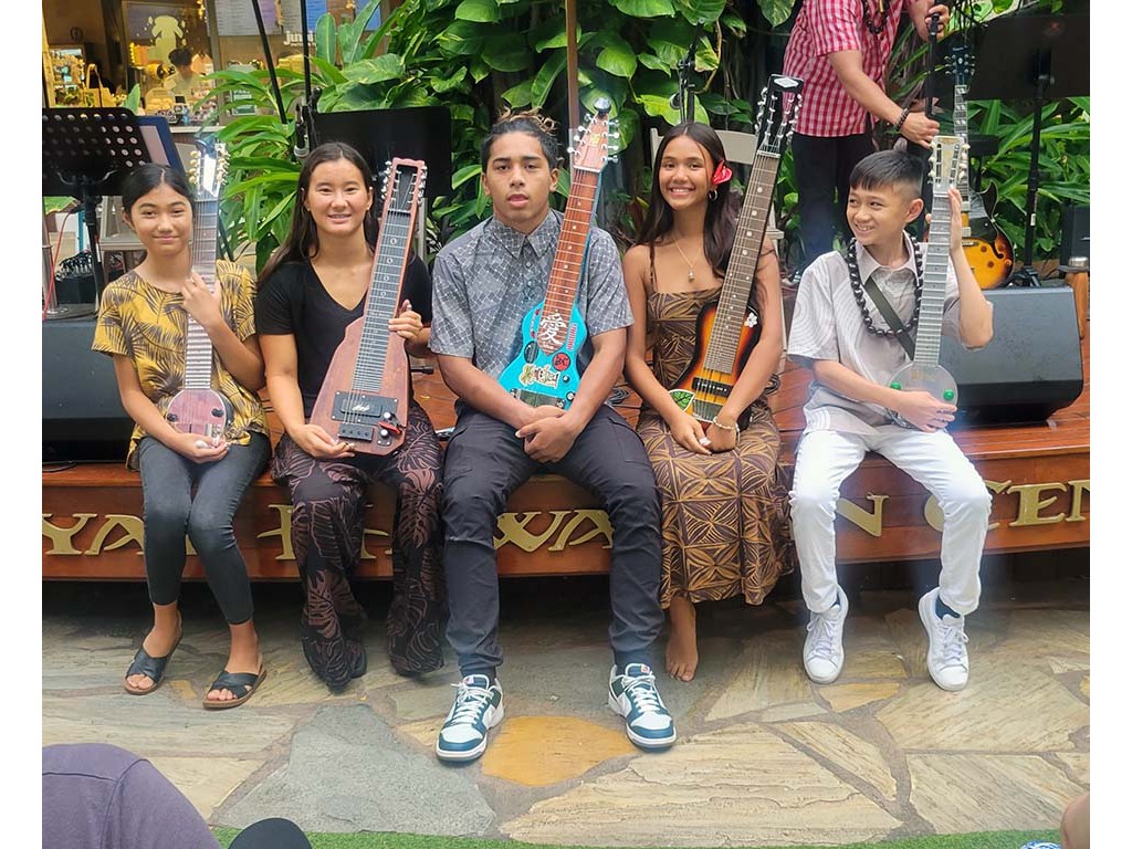 Thursdayʻs NextGen steel guitarists: Hiʻipoi Lindsey, Tai Misailidis, Enosa Lyman, Ever Taʻala, and Isaac Woodward.