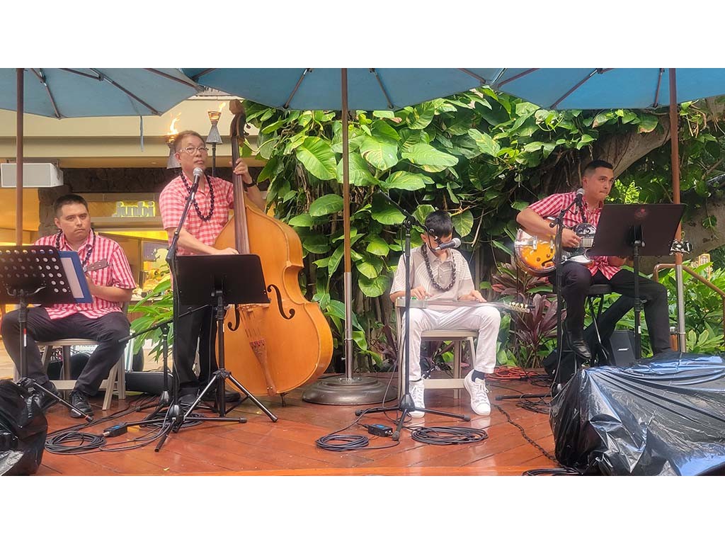 Hiʻipoi Lindsey and Isaac Woodward with Kaipo Lindsey, Alan Akaka, and David Woodward.Back to Gallery: 2025 Waikīkī Steel Guitar Week