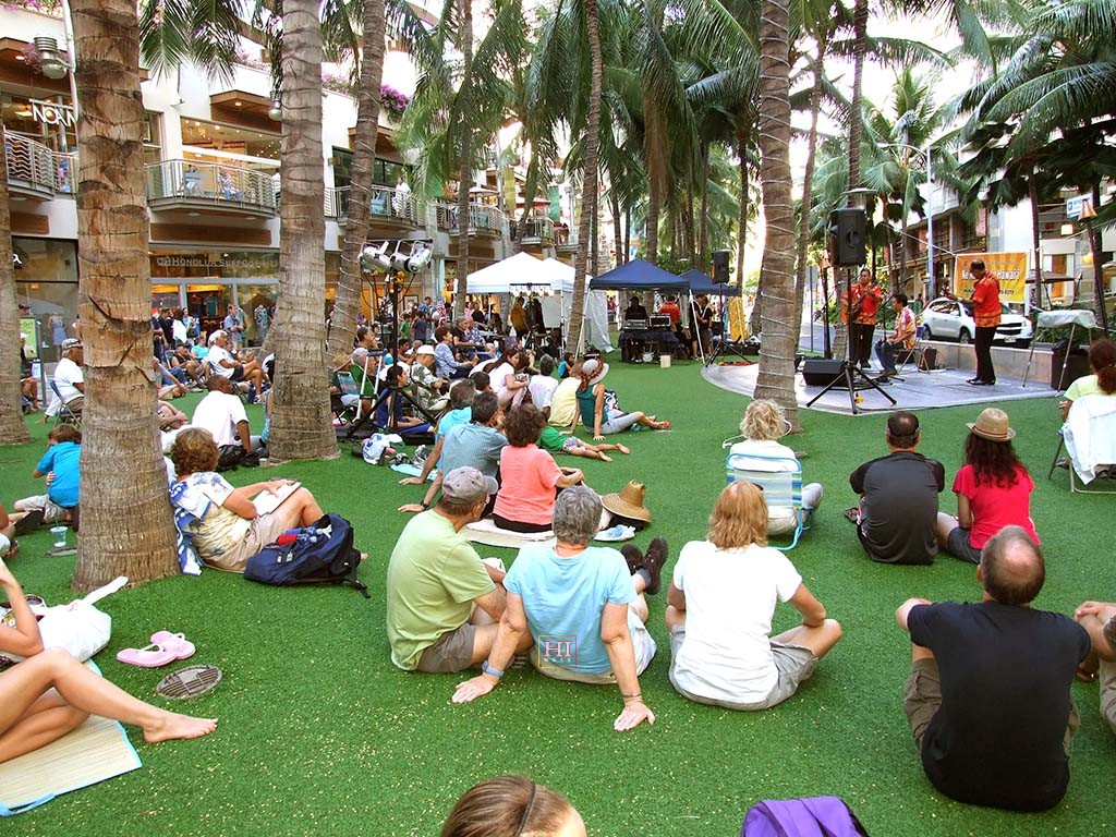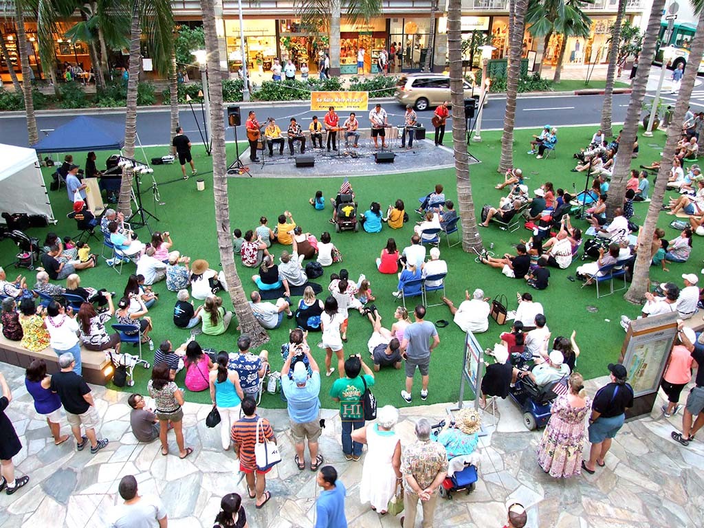 Another view of festival attendees. On stage: Kaipo Asing, Mark Prucha, Bobby Ingano, Keen Ching, Alan Akaka, Jeff Au Hoy, Casey Olson, Greg Sardinha, and Gary Aiko.Back to Gallery: 2013 Waikiki Steel Guitar Festival