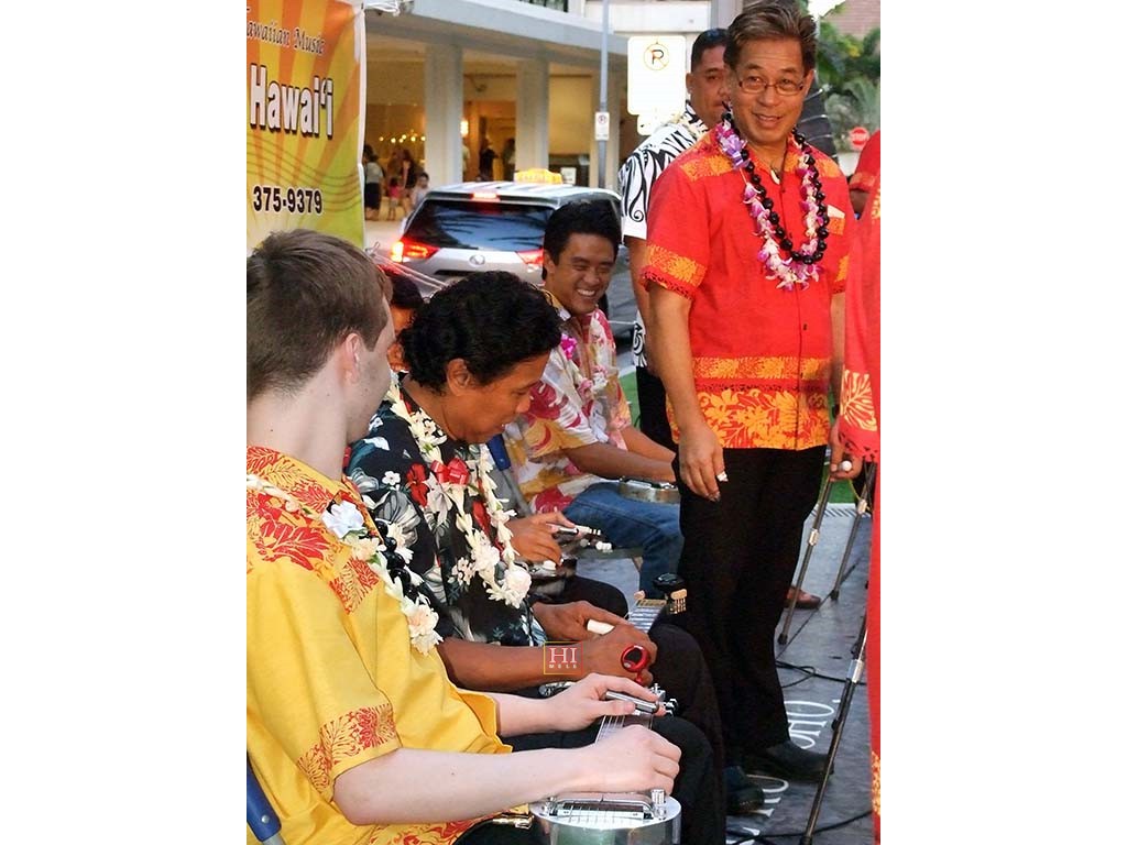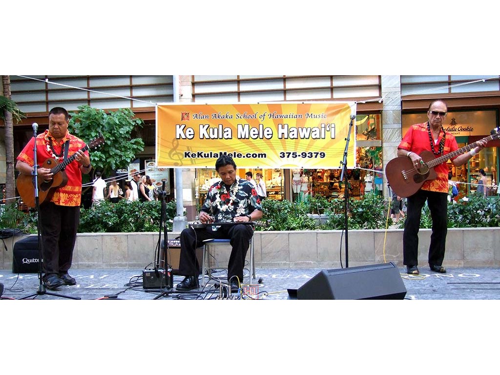 Ke Kula Mele Hawaii ensemble featuring Mark Prucha on the steel guitar and Kalyn Aolani on the 'Ukulele and steel guitar, with Ronald Tolentino, Alan Akaka, Quincy Maka'awa'awa, Sid Pang and Michiko Akaka.