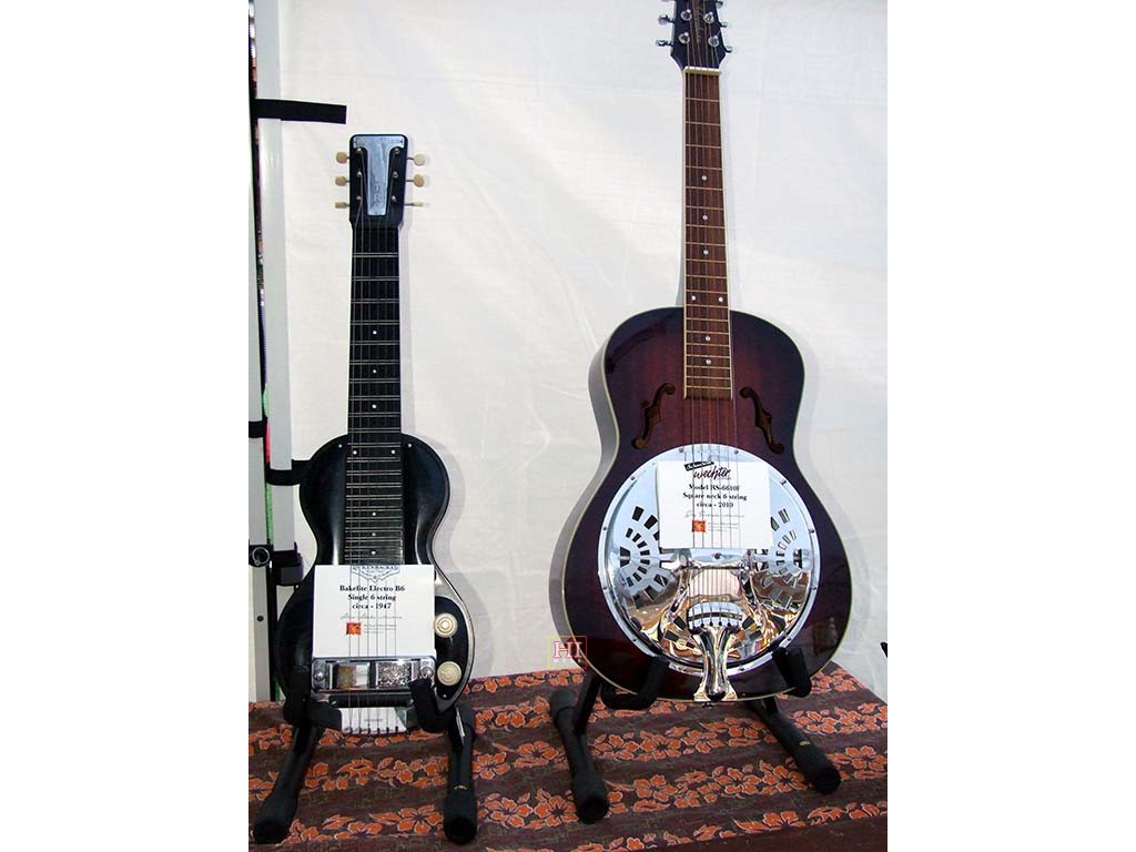 Left: Rickenbacher Bakelite Electro B6 6-string Steel Guitar, circa 1947. From the Alan Akaka collection. Right: Wechter RS6610F Square Neck 6-string Resonator Steel Guitar, circa 2010. From the Greg Sardinha collection.