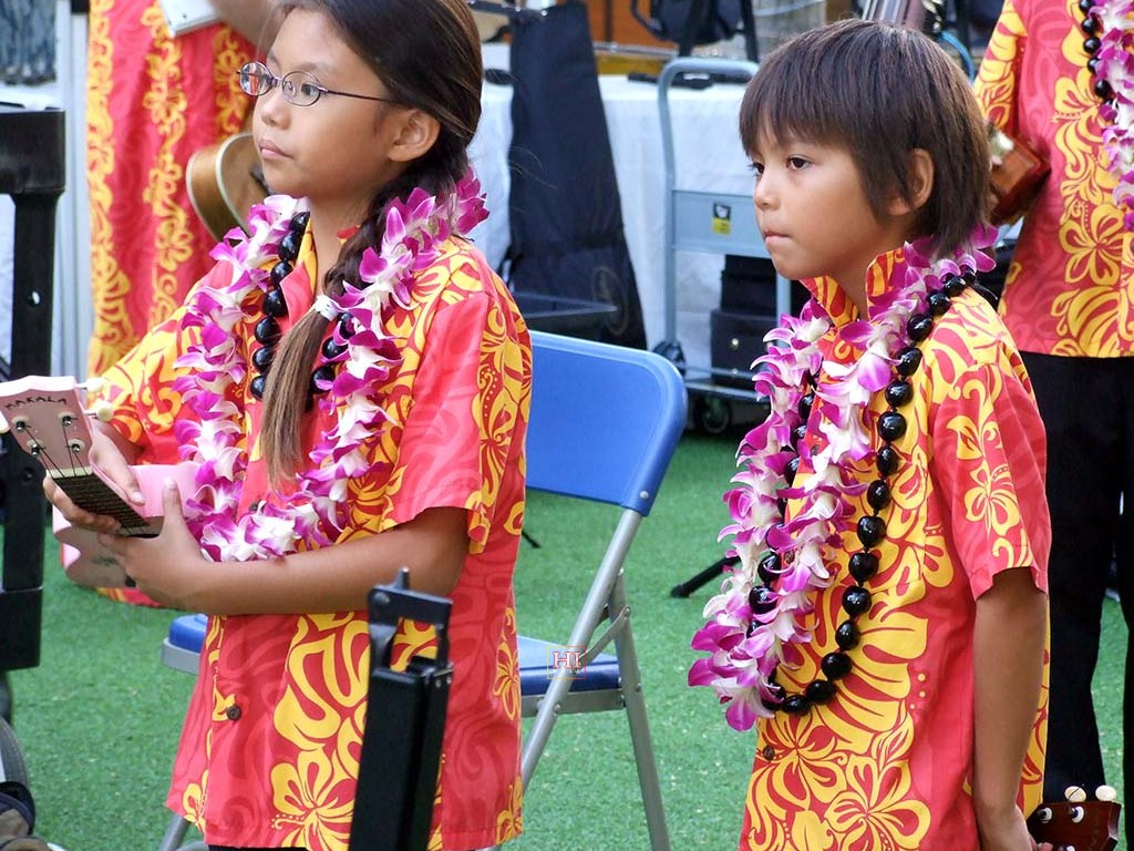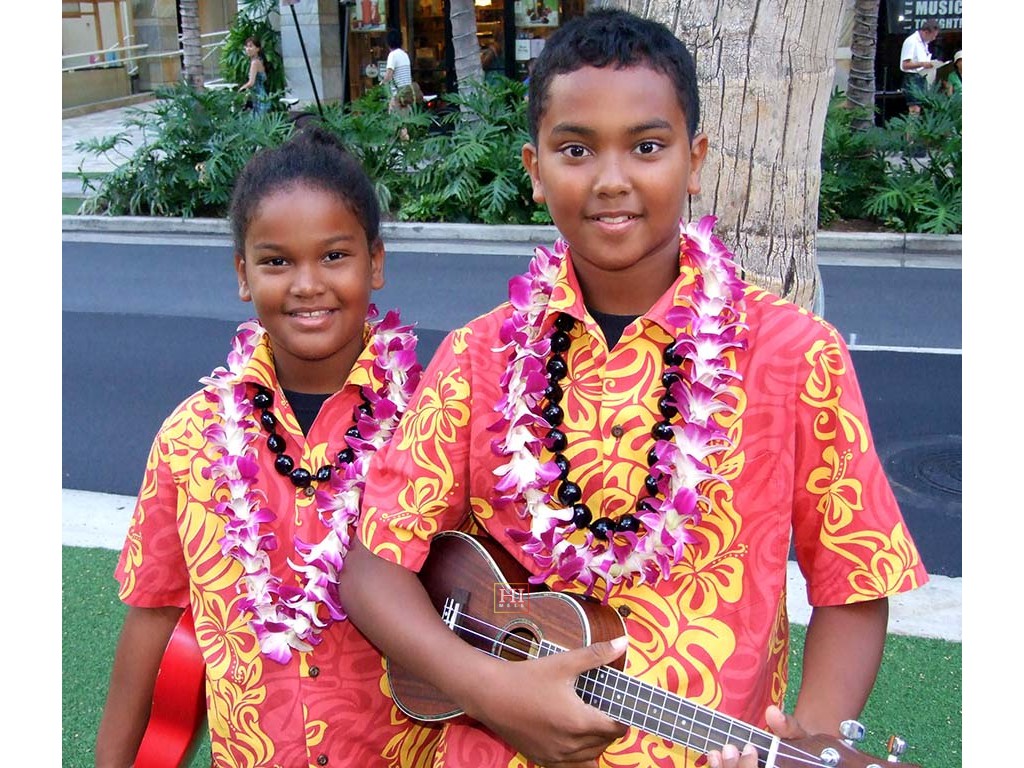 Ke Kula Mele Hawaii Ensemble players Lehua and Noah.