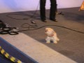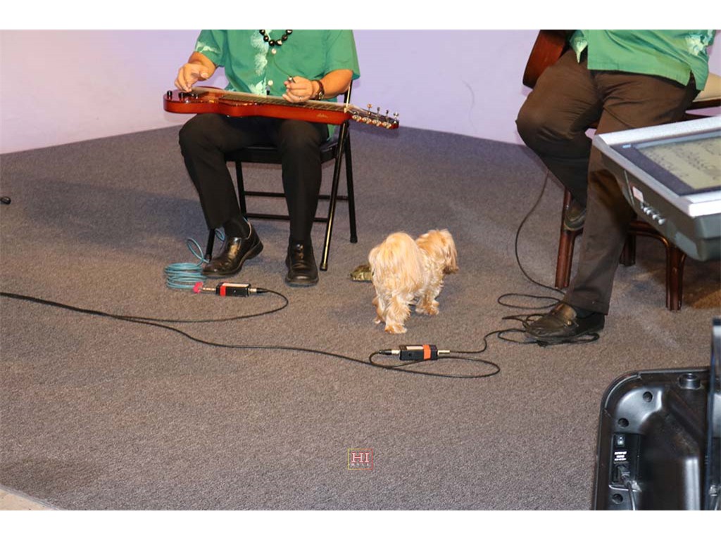 Sunny greets the musicians. Sunny is television personality Grace Lee's pet and one of the Hawaii News Now Sunrise team.