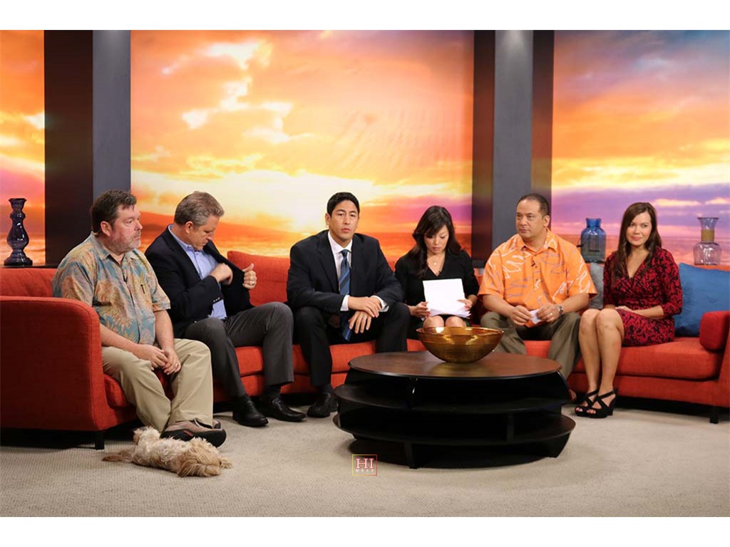 The Hawaii News Now Sunrise crew during a break: Howard Dicus with Sunny, Dan Cooke, Steve Uyehara, Grace Lee, and Billy V.