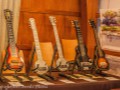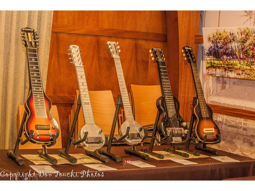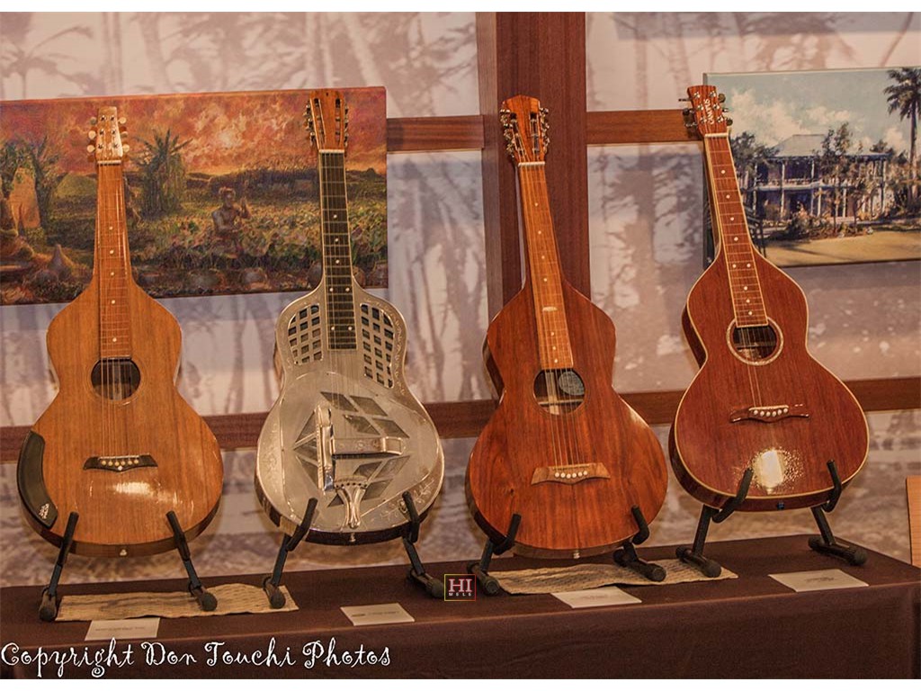 Some of the acoustic steel guitars at the vintage steel guitar exhibit in Helumoa Hale