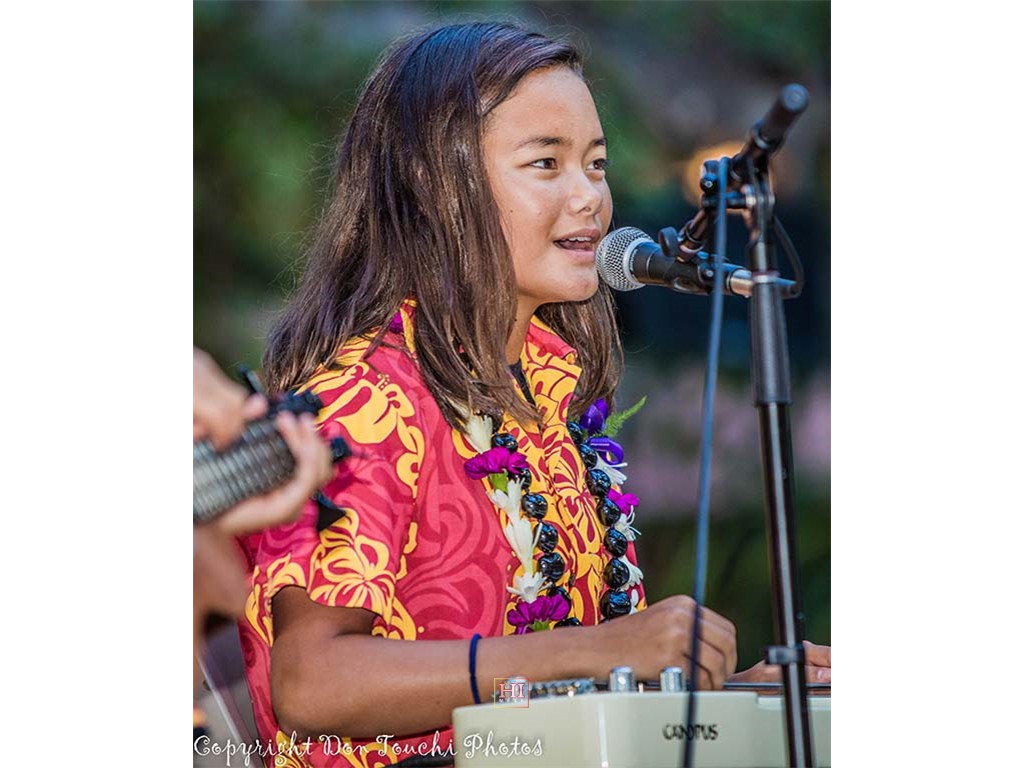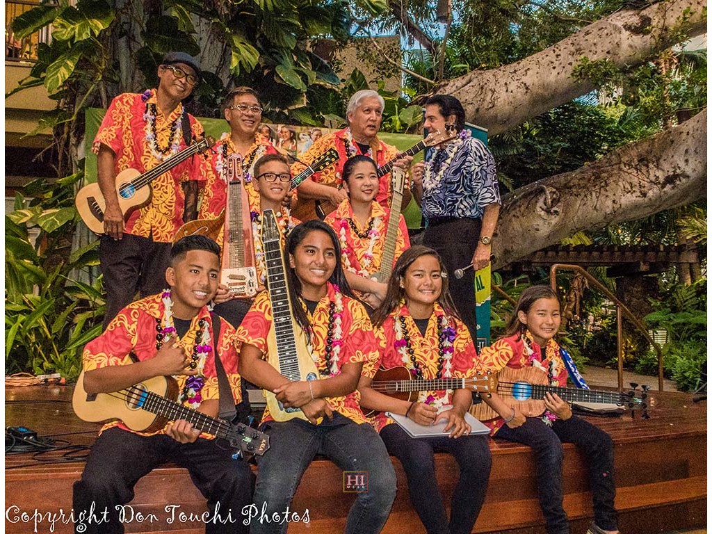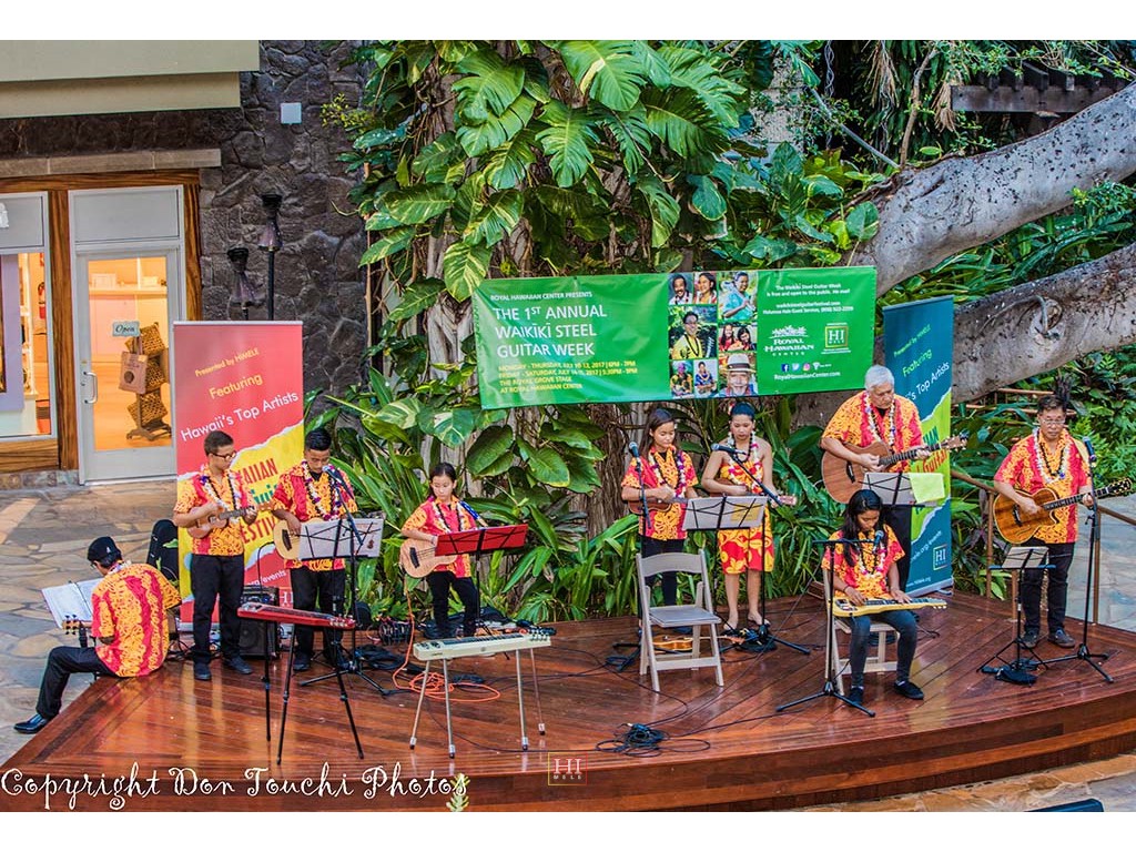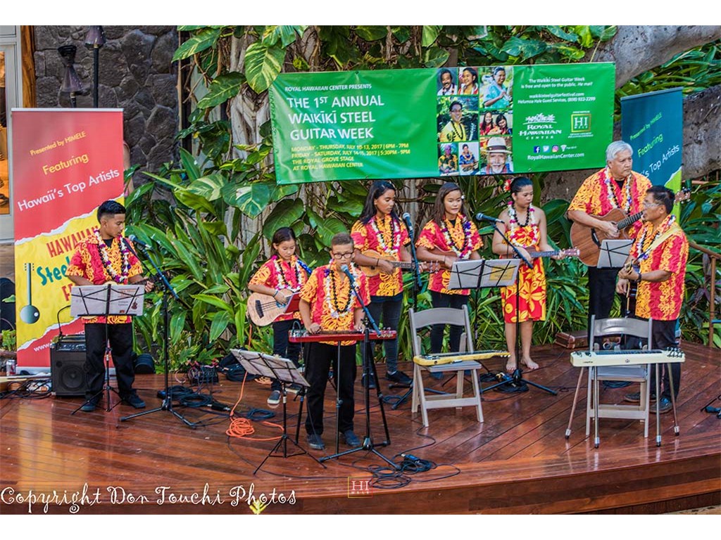 The 1st Annual Waikiki Steel Guitar Week Monday concert featured Next Generaion steel guitar students from Alan Akaka's Ke Kula Mele Hawaii School of Hawaiian Music accompanied by additional keiki ensemble students, Addison Ching, Ron Tolentino and Alan Akaka.