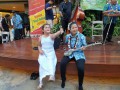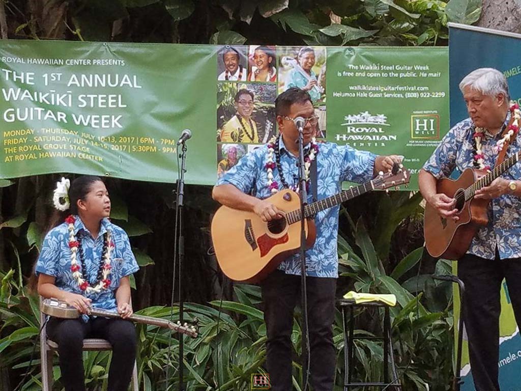 Alexis Tolentino getting ready for her segment as guitarists Alan Akaka and Addison Ching tune up.