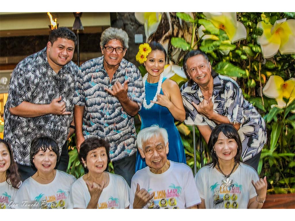 • Greg Sardinha and Poʻokela with Kapua Hayes and members of the Lion Lady Steel Guitar Ensemble: Masako Wakamatsu, Akiko Watanabe, Yoko Tanaka, Lion Kobayashi, and Sakae Machida.