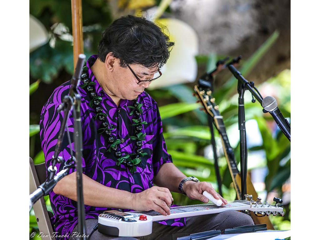 • Ke Kula Mele Hawaiʻi Makua steel guitarist and vocalist Heuʻi Bandmann.