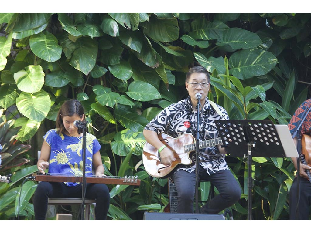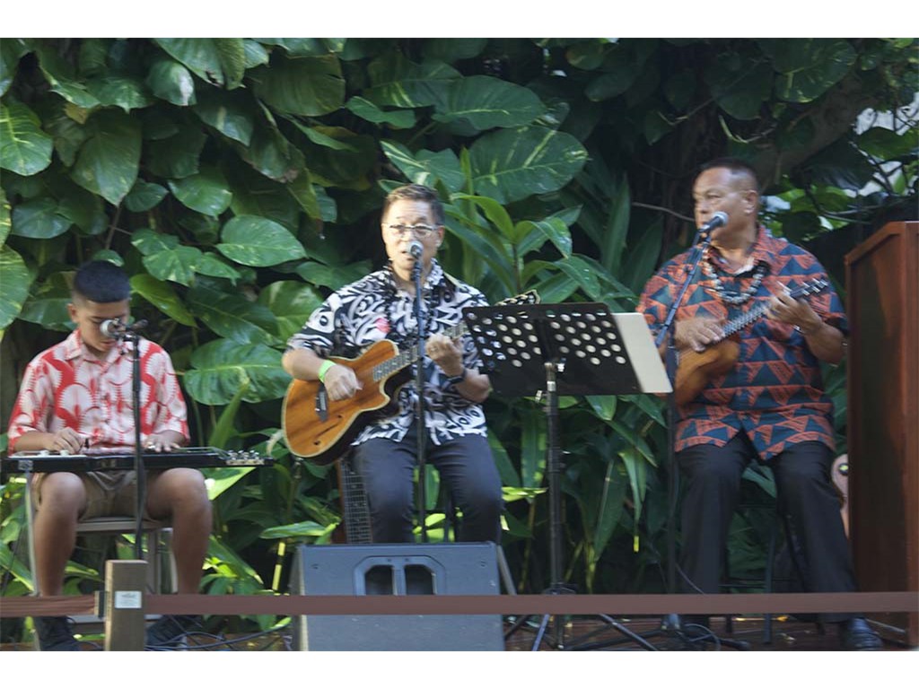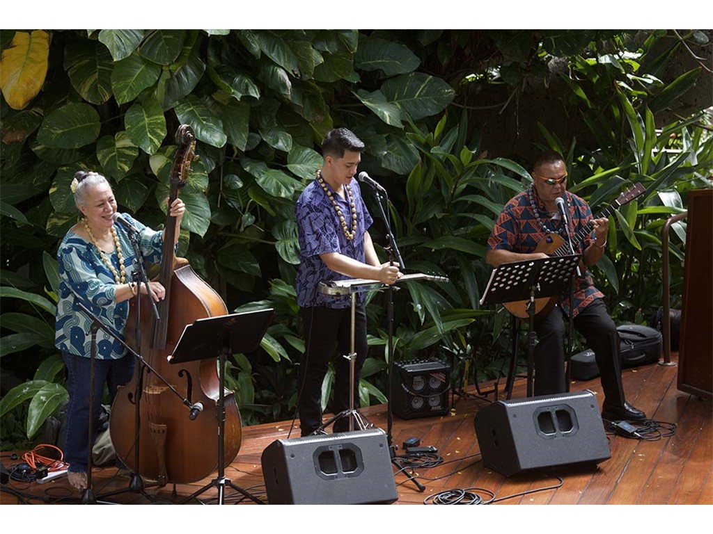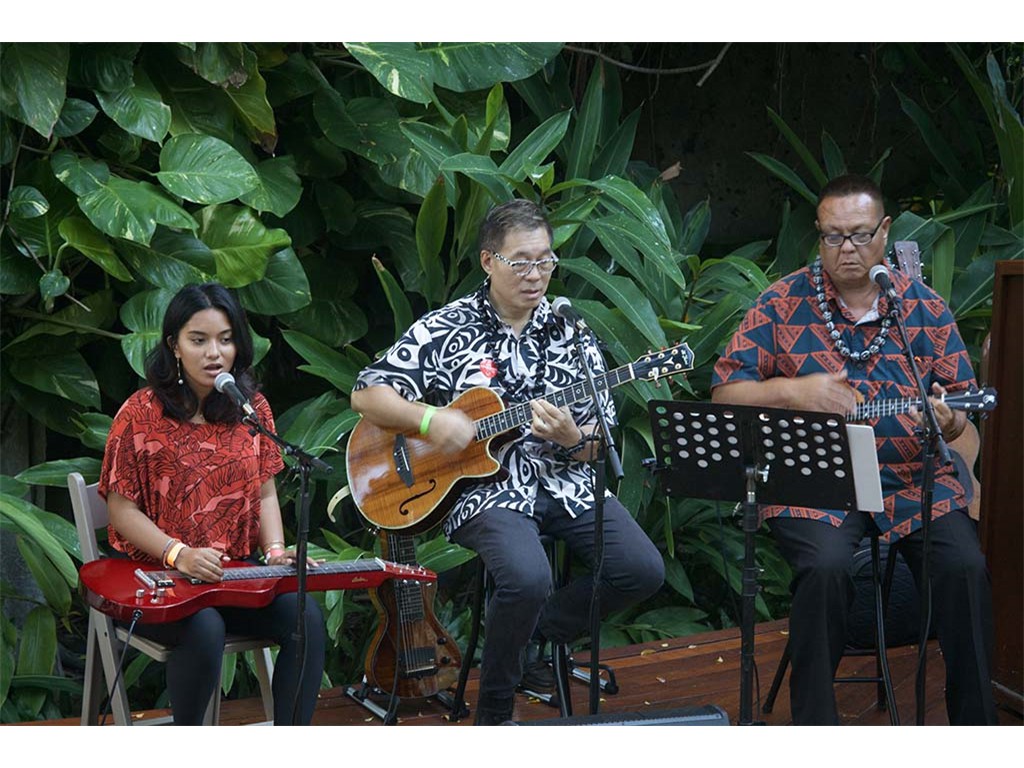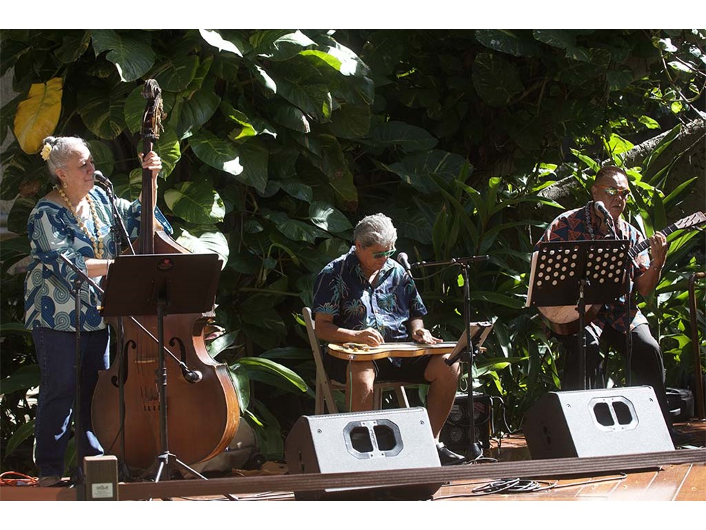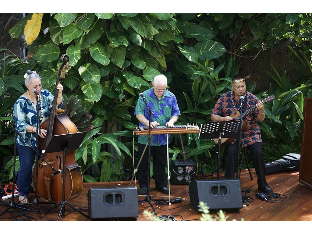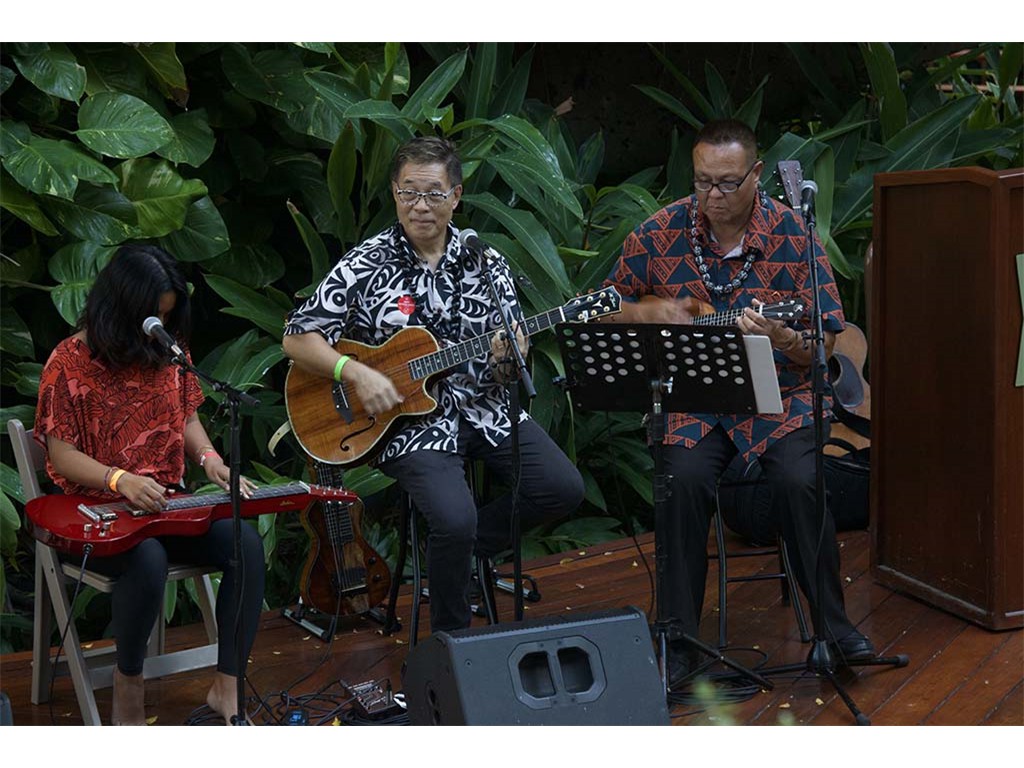 Featured steel guitar player Kapono Lopes with Helene Woodward and Kaipo Asing.