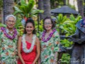Shuji Tomita, Kapuanani, and Noriko Tomita besides a bronze statue of Princess Bernice Pauiahi Bishop.