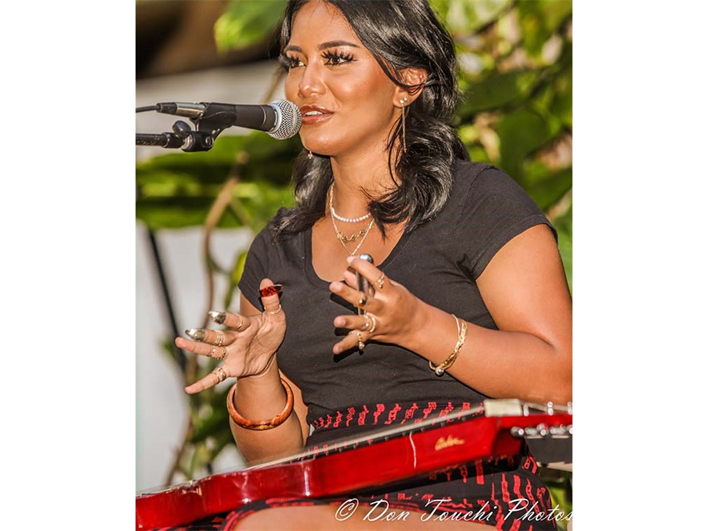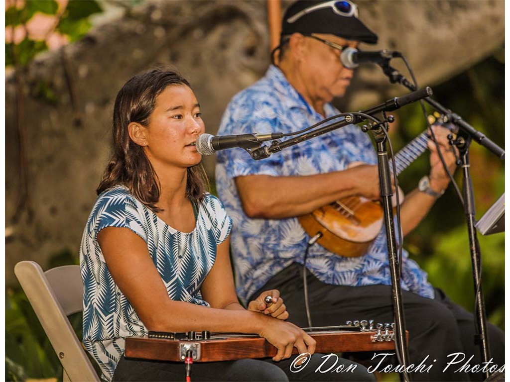 Photos of the NextGen steel guitarists from Alan Akaka's Ke Kula Mele Hawai‘i School of Hawaiian Music. NextGen steel guitarists performing include Isabella Bertelmann, Makamae Lyu-Napoleon, Tai Misailidis, Joey Misailidis, Mālie Lyman, and Ethan Goore.