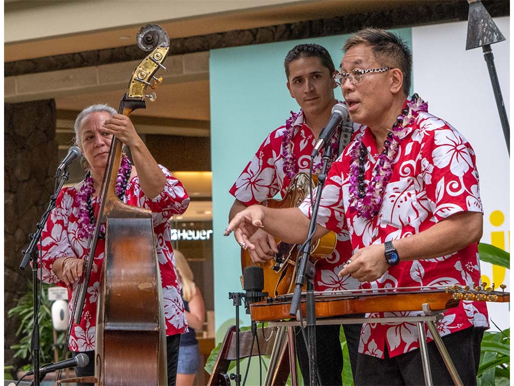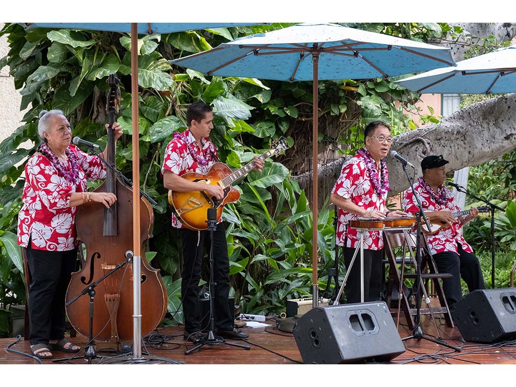 Featured steel guitarist Alan Akaka with Helene Woodward, Joseph Zayac, and Kaipo Asing.