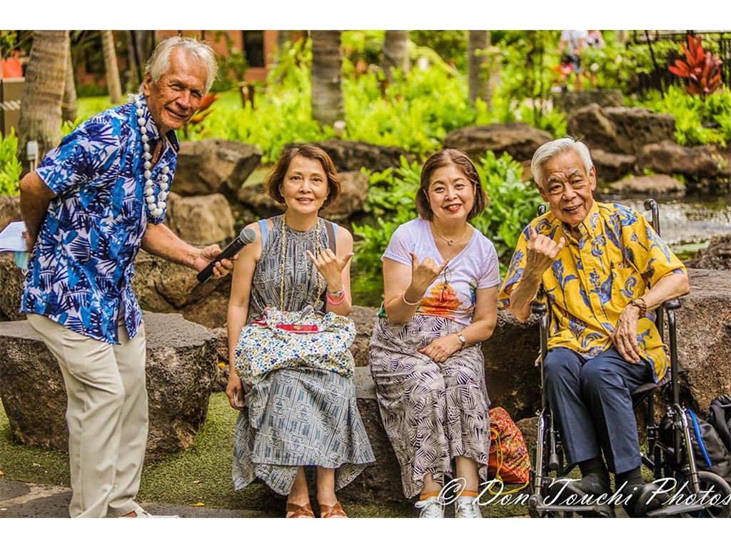 Emcee Kimo Kahoano with Japanese guests Haruko Ozeki, Masako Wakamatsu, and Kiyoshi ''Lion'' Kobayashi.