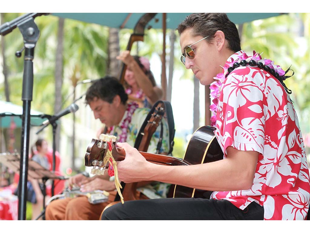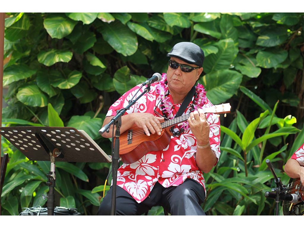 Featured steel guitarist Geronimo ''Geri'' Valdriz with Helene Woodward, Alan Akaka, Kaipo Asing, and Joseph Zayac.