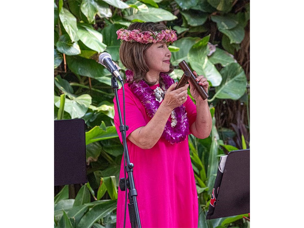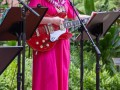 Alan Akaka stepped in as emcee for Masami Sato & Makana. From left: Masami Sato, Alan, and Ayumi Kato. Kazuko Tanaka on the steel guitar is behind Alan.